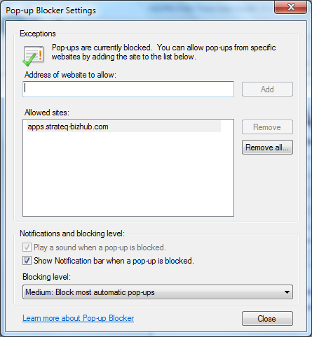 - Alternative, Go to Tools - “Pop-up Blocker Settings” windows, set to allow only pop-up from AGORA eProcurement System website URL of “apps.strateq-bizhub.com”