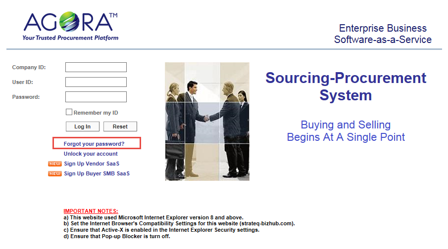 - Go to AGORA eProcurement portal, click "Forgot your password?"